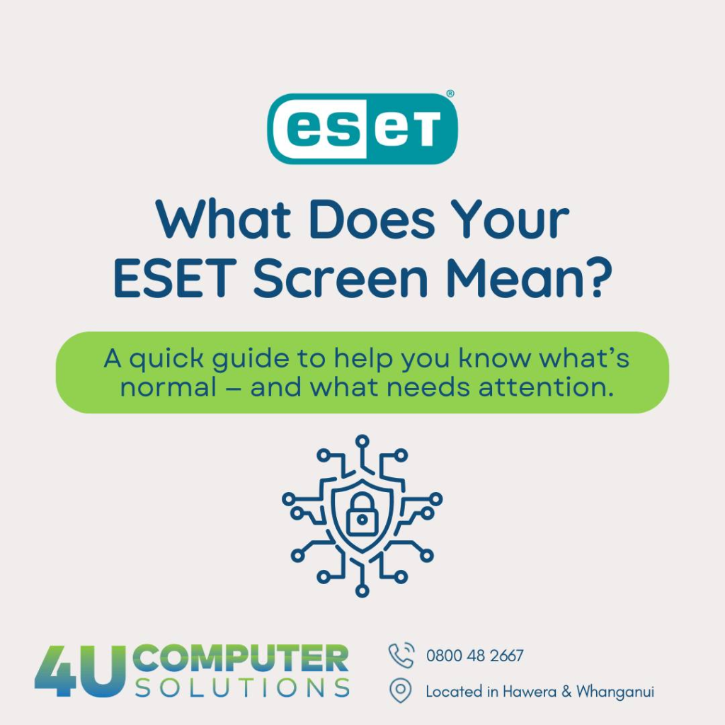 If you use ESET on your computer, you’ve probably seen the big coloured bar across the top of the window: green, yellow, or red. But what do those colours actually mean? And when is it time to give 4U Computer Solutions a call? Here’s a simple guide to help you tell the difference between “all […]